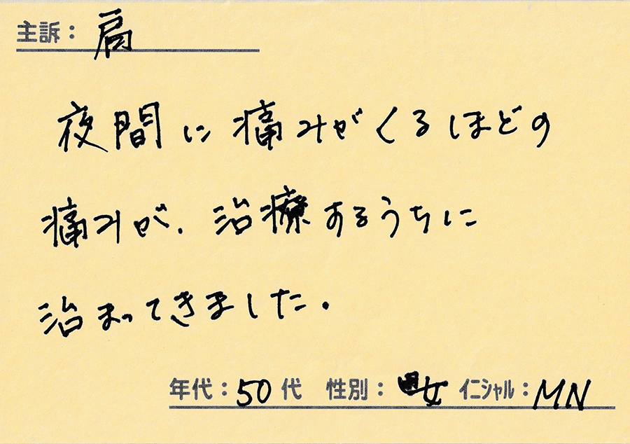 [施術者コメント] 肩関節周囲炎による夜間痛は本当に辛いですよね。痛みが強い間は集中的な治療をしながら、まずは夜の睡眠が十分に確保できるところを目標としますが、その後も痛みが取れるまではかなり時間を要することが多いです。根気よく治療を続けていただきながら、ご提案した運動法などにも積極的に取り組んでいただけましたので、痛みが落ち着き嬉しく思います。その後も定期的なケアを続けていただき、さまざまな症状にも早めに対応できていることで、日常的な健康管理の一助になれていれば幸いです。