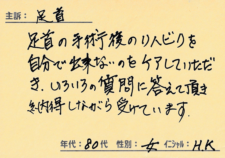 [施術者コメント] 手術に至るまでのお身体の状態を可能な限り良好に保つこと、そして手術後の回復にも鍼灸治療を併用されながらリハビリを進めていただくことも多くあります。痛みを少しでもコントロールしながら関節の拘縮や筋肉の萎縮を防ぐ上でも鍼灸治療がお力になれることがあります。病院で処方されるリハビリプログラムについてのご相談や、患部以外の痛みや異変についてもケアをさせていただきながら、H・Kさまが少しでも早く快復できますよう、これからもお力添えさせていただきます。