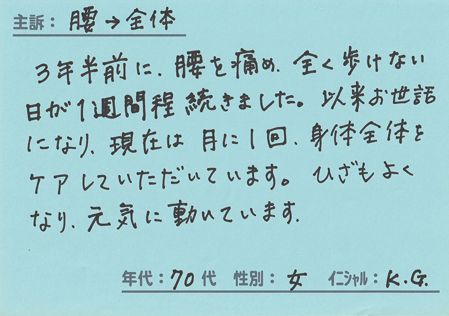 [施術者コメント] 初めは息子さんに連れられてやっとの思いで来院してくださいましたね。少しずつ腰の痛みと下肢への神経痛が落ち着き、その後も月に1回のケアを続けていただきながら、状態が安定していることを嬉しく思います。腰だけでなく膝の痛みもそうですが、K ・Gさまご自身が日常的に気を付けてくださってることが、「元気に動けている」1番の要因だと思います。外からの治療が必要なタイミングや、外からの治療で大きく変化できることもあったりしますが、やはり基本的には我々ができることは「お手伝い」です。患者さまそれぞれに条件の違いなどはあるかもしれませんが、定期的なケアで必要十分という健康状態を維持している力は、紛れもなく患者さまご自身の力だというふうに自信を持ってもらいたいです。
