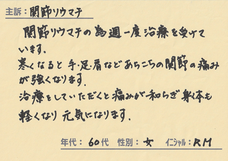 [施術者コメント] 関節リウマチの治療では抗リウマチ薬を中心に薬物治療が基本となりますが、薬物治療単独よりも鍼灸治療を併用する方が治療効果やQOL(生活の質)の改善度が高くなるという論文も報告されています。鍼灸治療だけで関節リウマチを治すことは難しいですが、鍼灸の持つ「鎮痛」「消炎」作用で痛みを和らげ機能障害を改善し、また倦怠感や食欲低下などの全身症状にも効果が期待できます。治療を継続していくことは大変ですが、定期的な治療を通してRMさまのQOL向上に役立てれば幸いです。